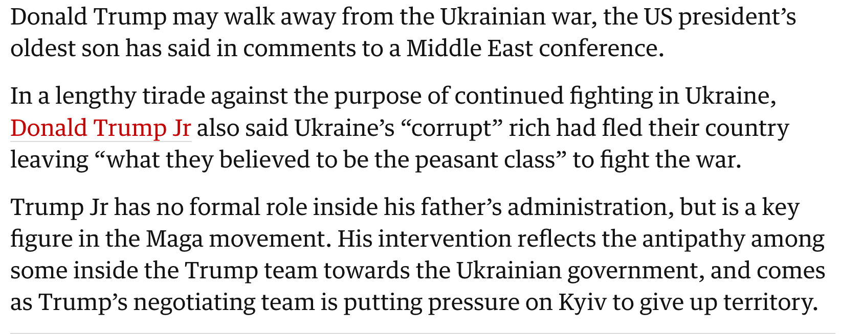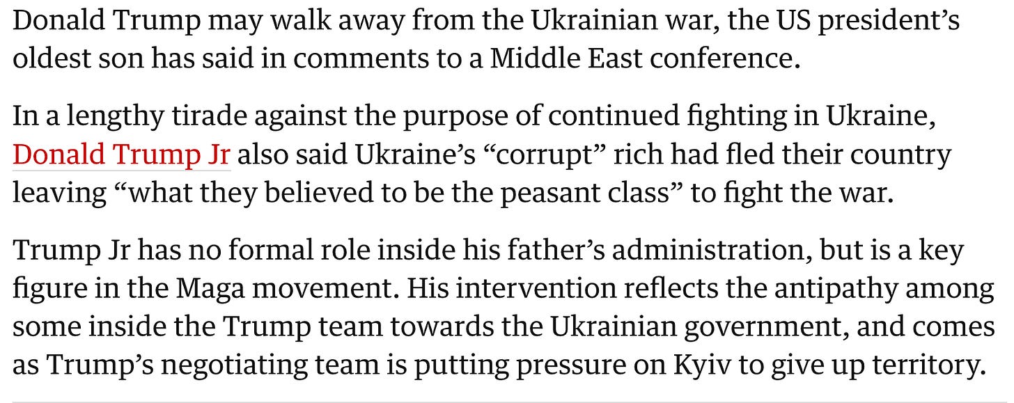 Like father….HARRY SHEARERDec 07, 20252137ShareThe Guardian reports that Donald Trump Jr. told a conference in Doha this:Maybe Jr. should get the Peace Prize…Thanks for reading! Subscribe for free to receive new posts and support my work.Subscribe